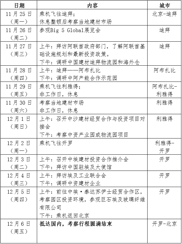 随着“一带一路”倡议的深入推进,中国与海湾国家经贸伙伴关系不断跃升,双向投资合作日趋升温。为推动建材行业企业对外投资合作平稳、有序、健康发展,帮助企业发掘贸易与投资合作潜力,推进务实合作,中国建筑材料联合会拟于2024年11月25-12月6日,组织建材经贸、投资合作代表团出访阿联酋、沙特和埃及进行商务考察,寻找合作机会。1. 组织召开与沙特、埃及工业、投资、建设等相关政府部门、商协会组织、投融资机构、当地建筑建材企业的经贸合作与投资项目对接会。2. 实地调研当地工业园区规划、政策、金融、劳动力等各方面情况,参观当地代表性企业,了解当地园区建设与发展的成功经验、遇到的问题及相关的政策建议等。3. 调研国际贸易海外仓、跨境电商、建材市场等,了解国际建材商贸流通及服务业的最新发展及相关问题。4. 参观中东地区最具影响力且是最大型的建筑、建材及服务类展览会,即“第45届中东迪拜五大行业展(BIG5)”。具体公务安排详见附件1。