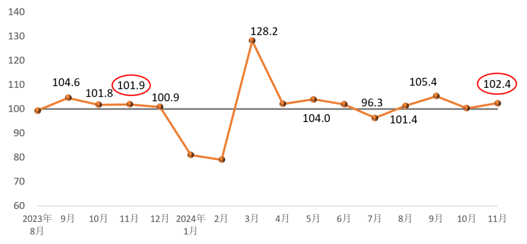 2024年11月份,建筑材料工业景气指数为102.4点,比10月份回升2.1点,比上年同月高0.5点,高于临界点,处于景气区间,行业经济运行企稳回复。