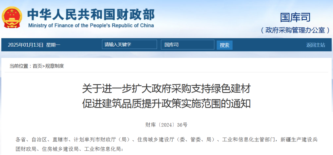 近日,财政部、住房城乡建设部、工业和信息化部等三部门发布《关于进一步扩大政府采购支持绿色建材 促进建筑品质提升政策实施范围的通知》。